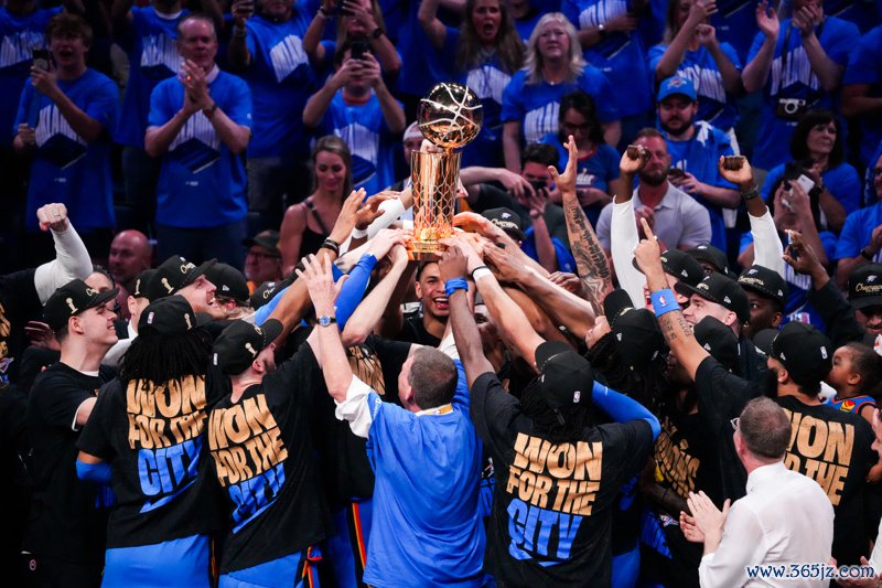 2025年6月23日,雷霆队夺冠后捧起奥布莱恩冠军奖杯庆祝。 当日,在2024-2025赛季NBA总决赛第七场比赛中,俄克拉荷马城雷霆队主场103比91征服印第安纳步行者队,总比分4比3夺冠。\n 新华社发(孙宇轩摄)
